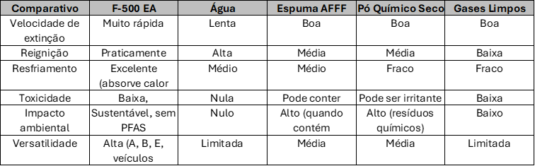 O combate a incêndios evolui constantemente em busca de soluções mais eficazes, sustentáveis e seguras. Entre as tecnologias mais inovadoras do setor, o agente encapsulador F-500 EA vem se destacando como uma alternativa de alto desempenho frente aos agentes extintores convencionais, como a água pura, espumas AFFF, pó químico seco e gases limpos.